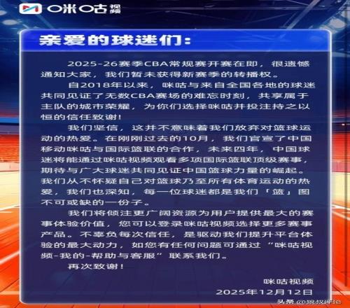 此前,由于咪咕和CBA官方谈判尚未达成一致,咪咕官方公开致信球迷:CBA常规赛开赛在即 很遗憾暂未获得新赛季转播权。