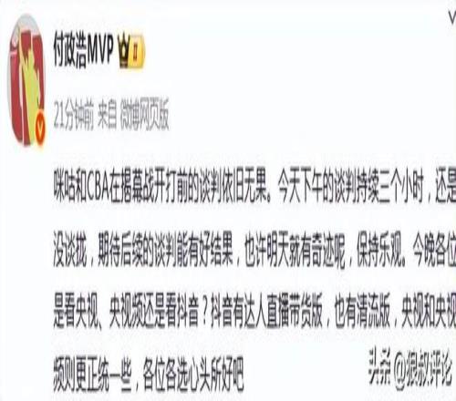 媒体人:CBA和咪咕在新赛季揭幕战前谈判三小时结果依旧没有谈拢