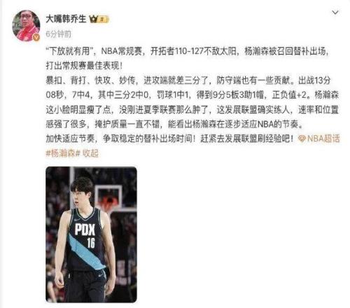 对此,19日,@大嘴韩乔生 发文:“‘下放就有用’,NBA常规赛,开拓者110-127不敌太阳,杨瀚森被召回替补出场,打出常规赛最佳表现!