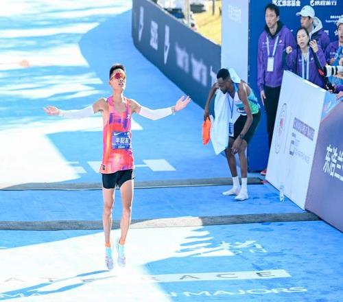 丰配友以2小时08分36秒的成绩获得国内男子组第一名。澎湃新闻记者 朱伟辉 图