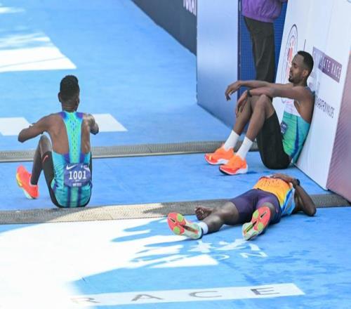 获得男子组前三名的选手冲过终点后分别坐或躺在地上。澎湃新闻记者 朱伟辉 图