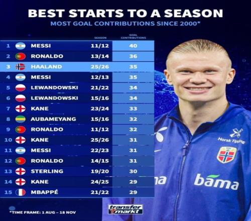 11月20报道 德转统计了本世纪赛季开局的进球贡献数,哈兰德以35粒进球位居历史第三,仅次于梅西和C罗。
