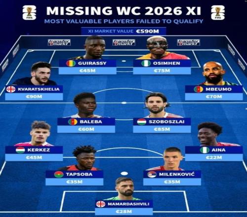 11月19报道 德转社媒晒图,列出无缘2026世界杯球员中身价最高的首发阵容,奥斯梅恩、姆伯莫、K77、索博斯洛伊等多名球星在列。