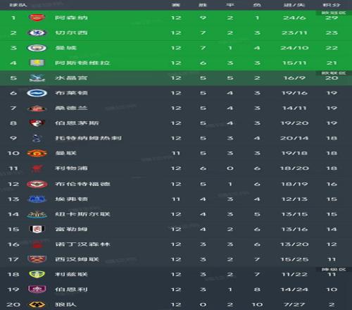 北京时间11月24日,英超第12轮结束了9场比赛 ,最新积分榜如下!